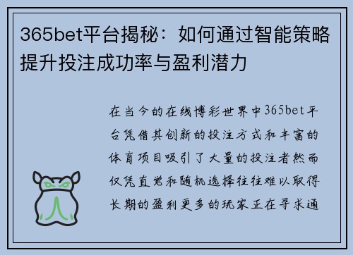 在当今的在线博彩世界中,365bet平台凭借其创新的投注方式和丰富的体育项目吸引了大量的投注者。然而,仅凭直觉和随机选择往往难以取得长期的盈利,更多的玩家正在寻求通过智能策略来提升投注成功率与盈利潜力。本文将揭示如何利用智能策略在365bet平台上提高投注效果,包括数据分析的应用、精准的投注模型、风险管理与资金分配策略,以及心理素质的调整与控制。通过这四个方面的详细阐述,玩家们可以更好地理解如何在竞争激烈的博彩环境中脱颖而出。