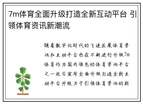 随着数字化时代的飞速发展,体育资讯和互动平台也在不断进行升级。7m体育,作为国内领先的体育资讯平台之一,近日宣布全面升级,打造全新互动平台,并致力于引领体育资讯的新潮流。此次升级不仅涉及平台的功能优化和界面设计,还包括用户体验的提升、内容创新、社交互动的增强等多个方面。7m体育通过这些改变,力求为广大体育迷提供更高效、更便捷、更个性化的体育资讯和互动体验。本文将从平台升级的四个主要方面进行详细阐述,分别是:功能升级与平台优化、社交互动和社区建设、内容创新与个性化推荐、用户体验的全面提升。通过这些方面的深入剖析,本文将展示7m体育如何引领体育资讯的新潮流,成为未来体育行业的重要趋势。
