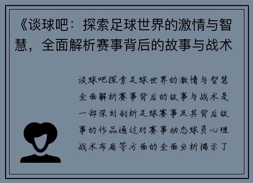 《谈球吧:探索足球世界的激情与智慧,全面解析赛事背后的故事与战术》是一部深刻剖析足球赛事及其背后故事的作品,通过对赛事动态、球员心理、战术布局等方面的全面分析,揭示了足球这项全球性运动的独特魅力与复杂性。本书不仅仅是对足球技术与战术的简单描述,它还从多个角度探讨了足球的历史背景、文化影响、以及球迷的情感体验。通过对全球顶级赛事和球队的详细解读,带领读者走进足球世界的背后,感受其中的激情与智慧。本文将从四个主要方面,对《谈球吧》进行详细解读,分别是:足球赛事的激情与动人故事,战术分析与比赛策略的智慧,球员背后的心理与成长轨迹,足球文化对全球的深远影响。